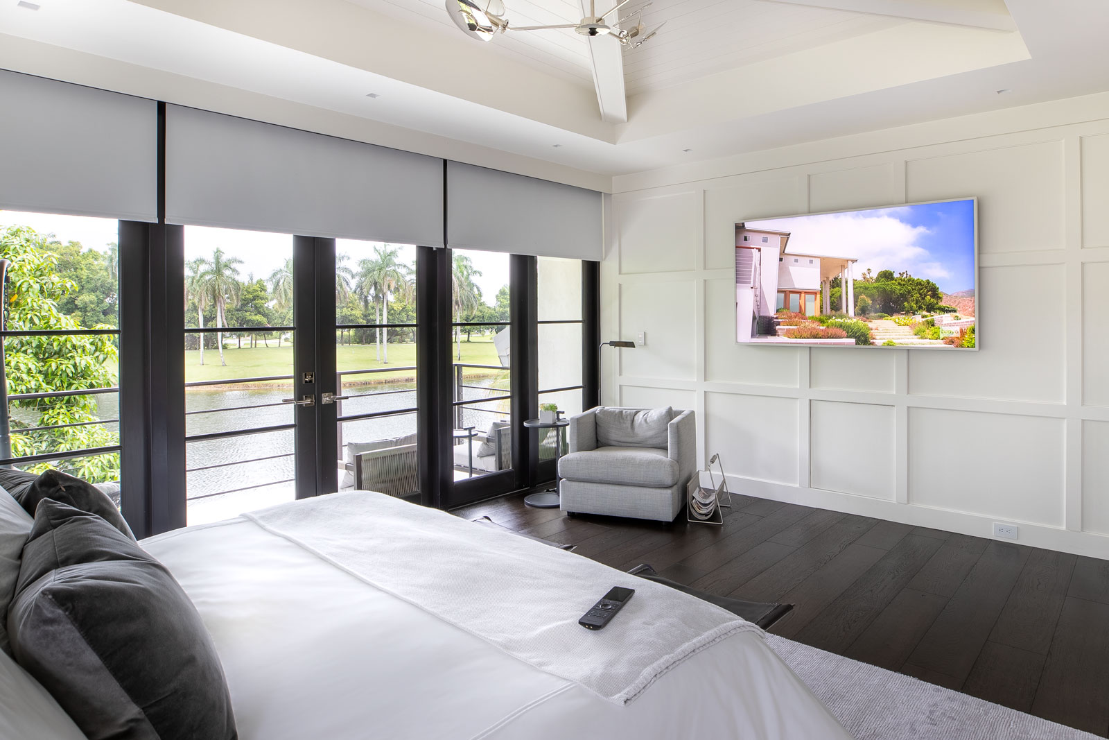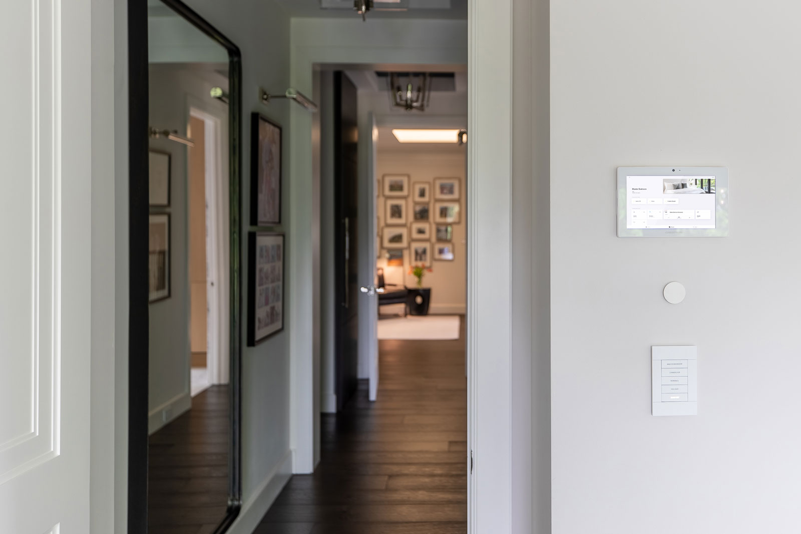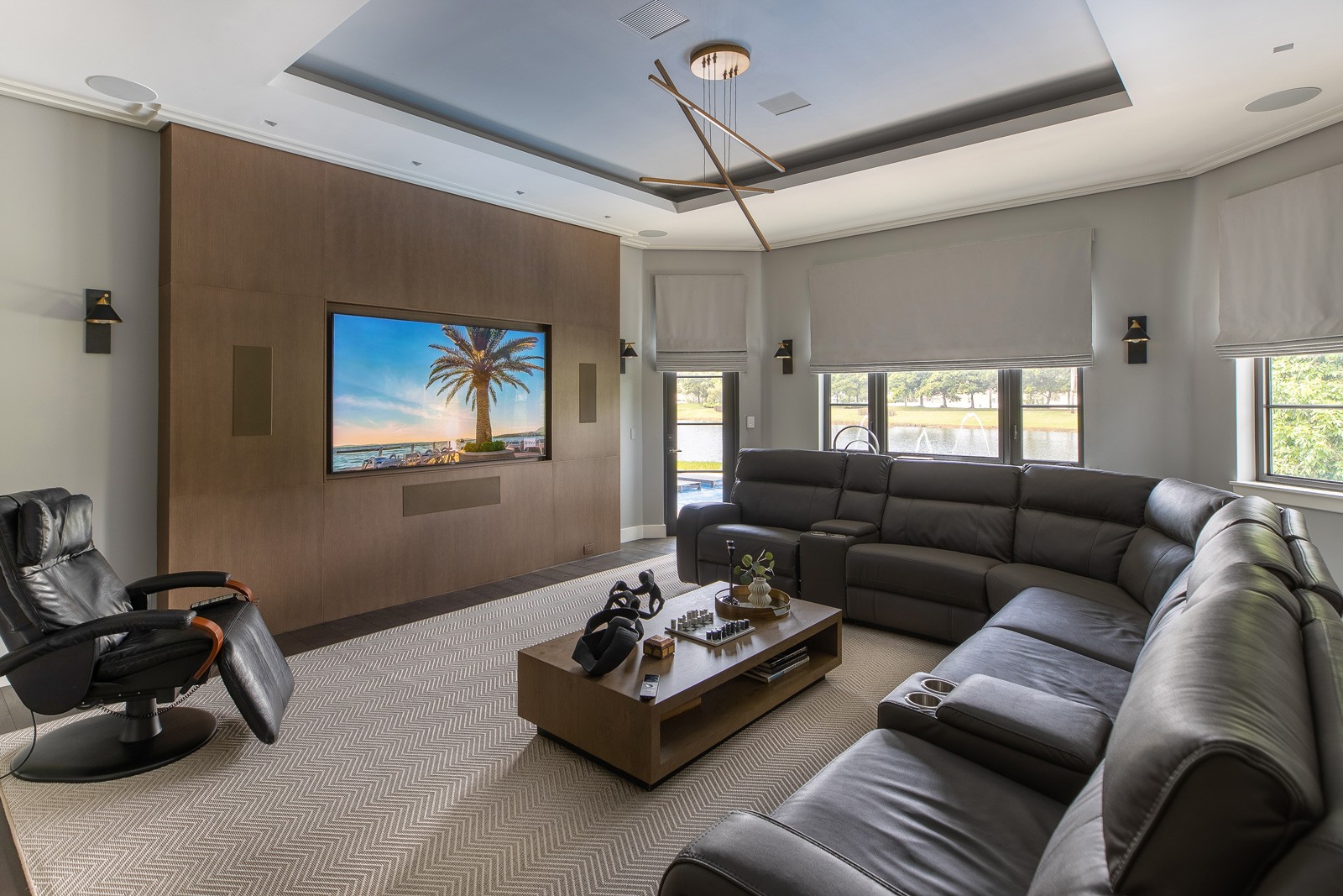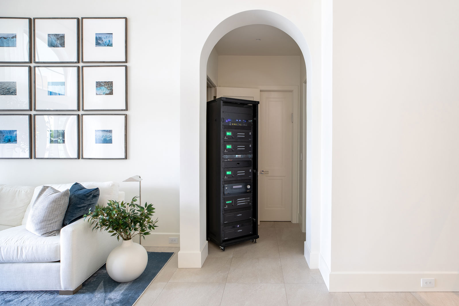 The owners wanted to have clean architectural looks throughout, so a centralized lighting system with Horizon keypads was an absolute must. Our design team carried the same concept to speakers, displays and touch panels, carefully blending every component into the architectural features of the home.